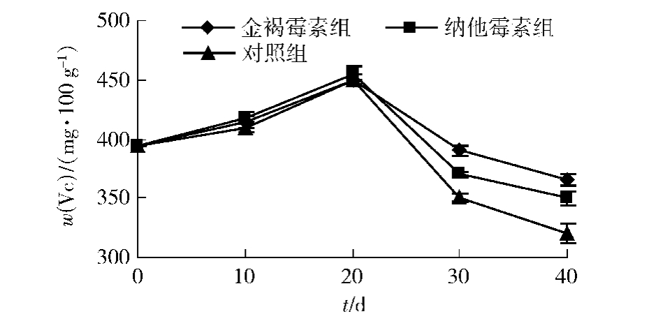 冬枣贮藏效果可由Vc含量变化直接反映,一般只要Vc含量高,其他性能均表现良好 [16,23-24] ,如图3。由图3看出,贮藏到20 d,Vc含量呈上升趋势,20 d以后开始下降,金褐霉素和纳他霉素均能很好地抑制Vc含量的下降。贮藏到40 d,金褐霉素和纳他霉素处理组很好地抑制Vc含量的下降,但金褐霉素组处理效果优于纳他霉素处理组,各处理组与对照组之间差异显著。