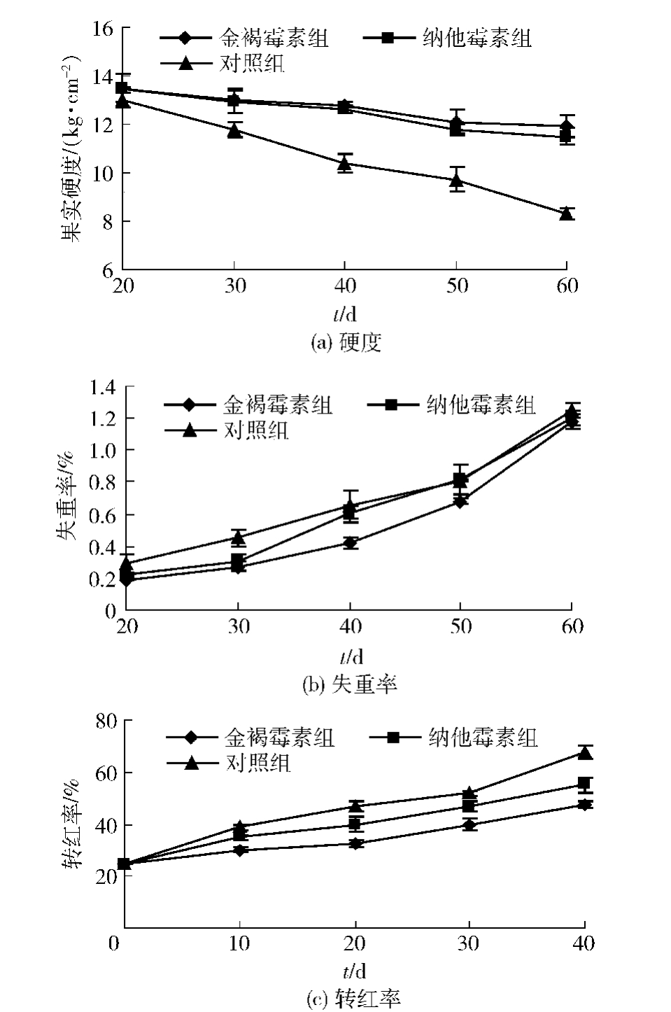 采后冬枣果实的硬度呈逐渐下降趋势,数据为每处理组分别取10个枣果测定平均值,最初硬度为13.9 kg/cm 2 ,如图1。由图1(a)可以看出,两种生物源防腐剂处理能很好地保持果实硬度。贮藏到30 d,各处理组间硬度差异不显著。贮藏60 d,金褐霉素处理组的硬度平均为11.9 kg/cm 2 ,纳他霉素处理组的硬度平均为11.5 kg/cm 2 ,对照组效果差仅为8.3 kg/cm 2 。生物源防腐剂处理组与对照组之间差异显著(P<0.05),两种生物源防腐剂处理间差异不显著,但金褐霉素处理组效果稍优于纳他霉素处理组。图1(b)的结果表明,各处理组间失重率差异不显著。对照组、金褐霉素处理组与纳他霉素处理组效果相近。从图1(c)可以看出,贮藏到10 d,各处理组间转红率差异不显著。贮藏40 d,各处理组间转红率差异显著,金褐霉素处理组明显降低冬枣转红率,效果优于纳他霉素处理组。
