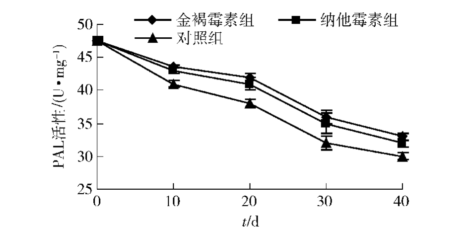 PAL活性被认为是抗病指标之一,它是苯丙烷类次生代谢的限速酶 [16,23-24] 。金褐霉素与纳他霉素处理对贮藏期冬枣果实PAL活性的影响见图6。