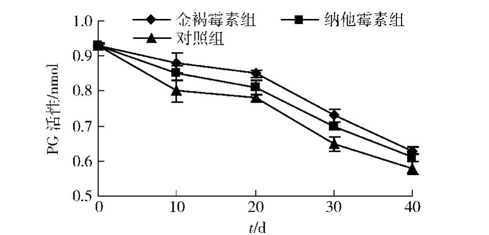 果实的软化及货架寿命与细胞壁水解酶的活性,尤其与多聚半乳糖醛酸酶的活性密切相关 [16,23-24] 。图5显示了冬枣低温贮藏期金褐霉素与纳他霉素处理对冬枣果实多聚半乳糖醛酸酶活性的影响。结果表明:4℃条件下,贮藏前20 d,PG活性缓慢下降,金褐霉素与纳他霉素处理组的抑制作用明显;贮藏20~40 d,PG活性下降较快,生物源防腐剂处理组对PG活性的抑制作用明显。贮藏到40 d,金褐霉素、纳他霉素处理组与对照组无显著差异,金褐霉素组效果稍优于纳他霉素处理组。