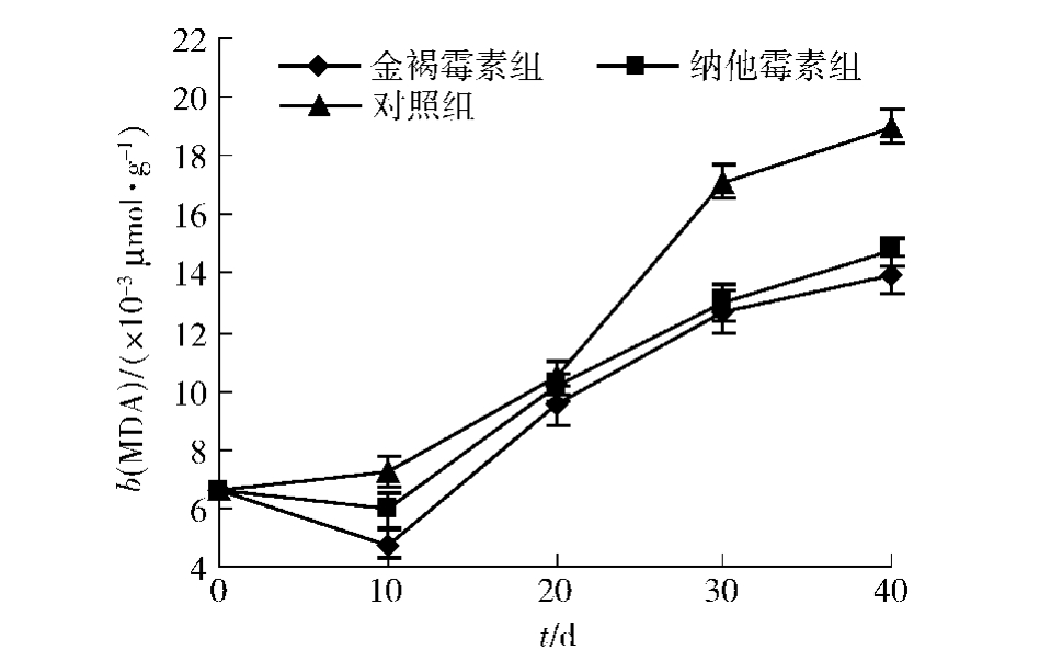 由图4可以看出,贮藏过程中冬枣的丙二醛含量均呈不断上升趋势,贮藏前期30 d,生物源防腐剂组对MDA的抑制作用未明显显现。贮藏到40 d,金褐霉素和纳他霉素处理组的MDA含量均低于对照组,并且金褐霉素处理组更显著抑制了丙二醛含量的增加,其MDA含量显著低于对照组MDA含量,效果也优与纳他霉素处理组。