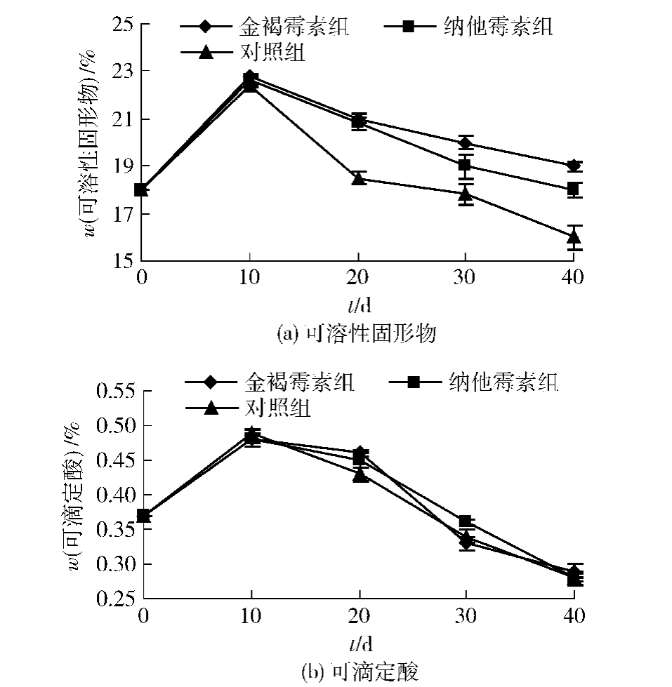 枣果中可溶性固形物主要是可溶性糖,其含量高低是评价果实质量好坏的重要指标 [16,23-24] ,如图2。从图2(a)可以看出,贮藏到10 d,生物源防腐剂处理组及对照的可溶性固性物含量均有小幅升高,而后随贮藏时间延长而逐渐降低。对照组与生物源防腐剂处理组间开始显现差异,对照组可溶性固性物下降速度显著高于处理组。贮藏到40 d,纳他霉素处理效果与对照组差异显著;金褐霉素处理组显著抑制了冬枣果实中可溶性固形物含量的下降,与对照组之间差异极显著。
