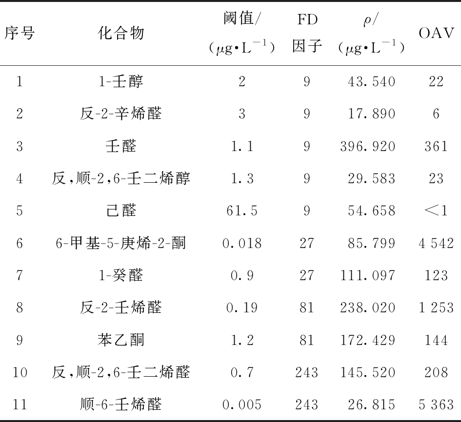 大多数情况下,FD因子和OAV基本呈对应关系,即FD因子越高,OAV越大,该物质活性越大,对西瓜汁整体气味的贡献越大,如反-2-壬烯醛、反,顺-2,6-壬二烯醛和顺-6-壬烯醛等(见表4)。但是也有一些例外,如己醛,FD因子为9,而OAV值却小于1。造成这种结果的原因可能是气味化合物与基质的相互作用(协同或拮抗)。而且计算OAV的时候是假设每个化合物的含量与OAV间的关系是线性的[19];但是,实际上气味化合物的对数浓度和该物质对整体气味的贡献作用不完全是线性关系,有的是S型的关系,且各化合物气味强度的个体差异也不能忽视[17]。